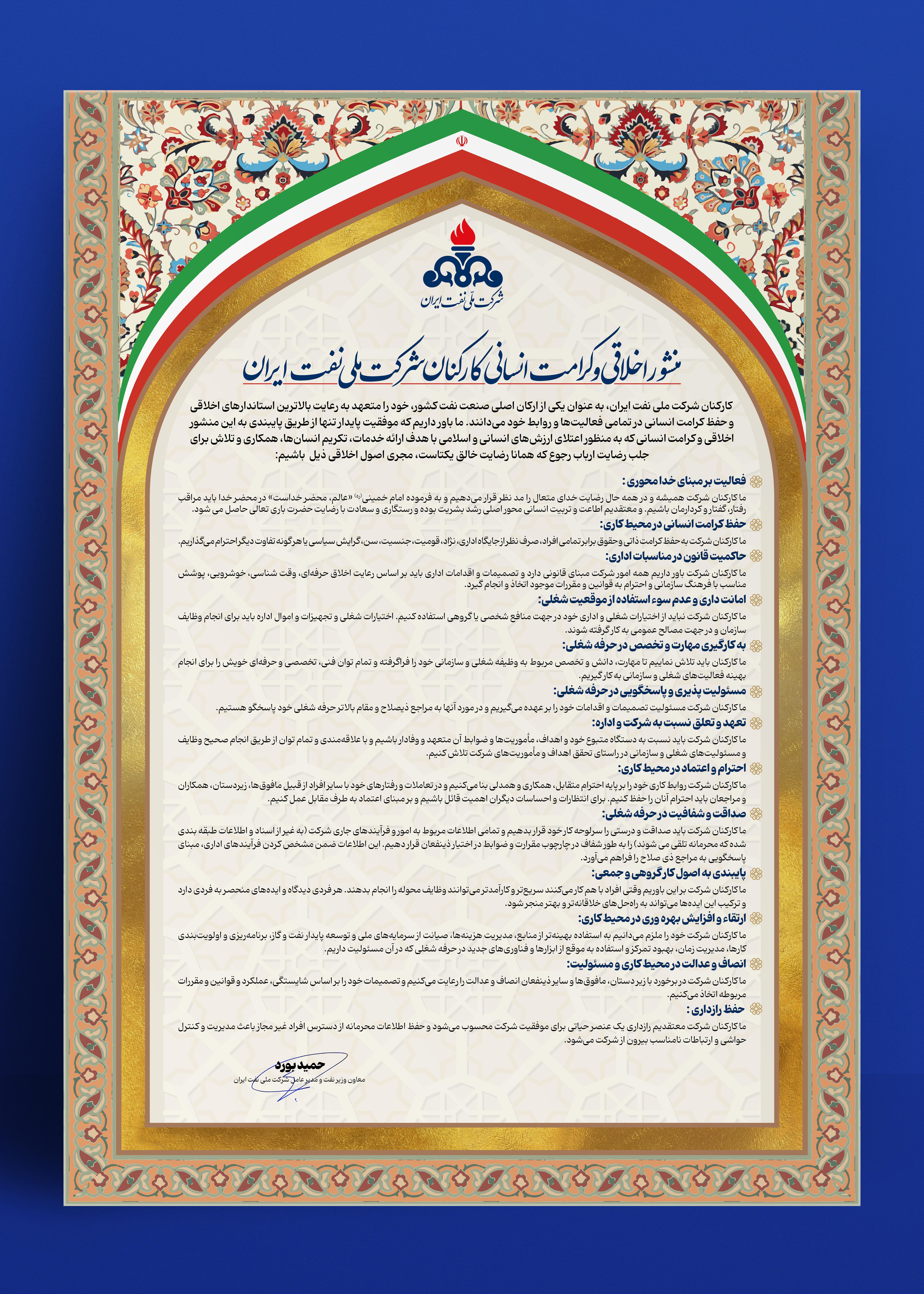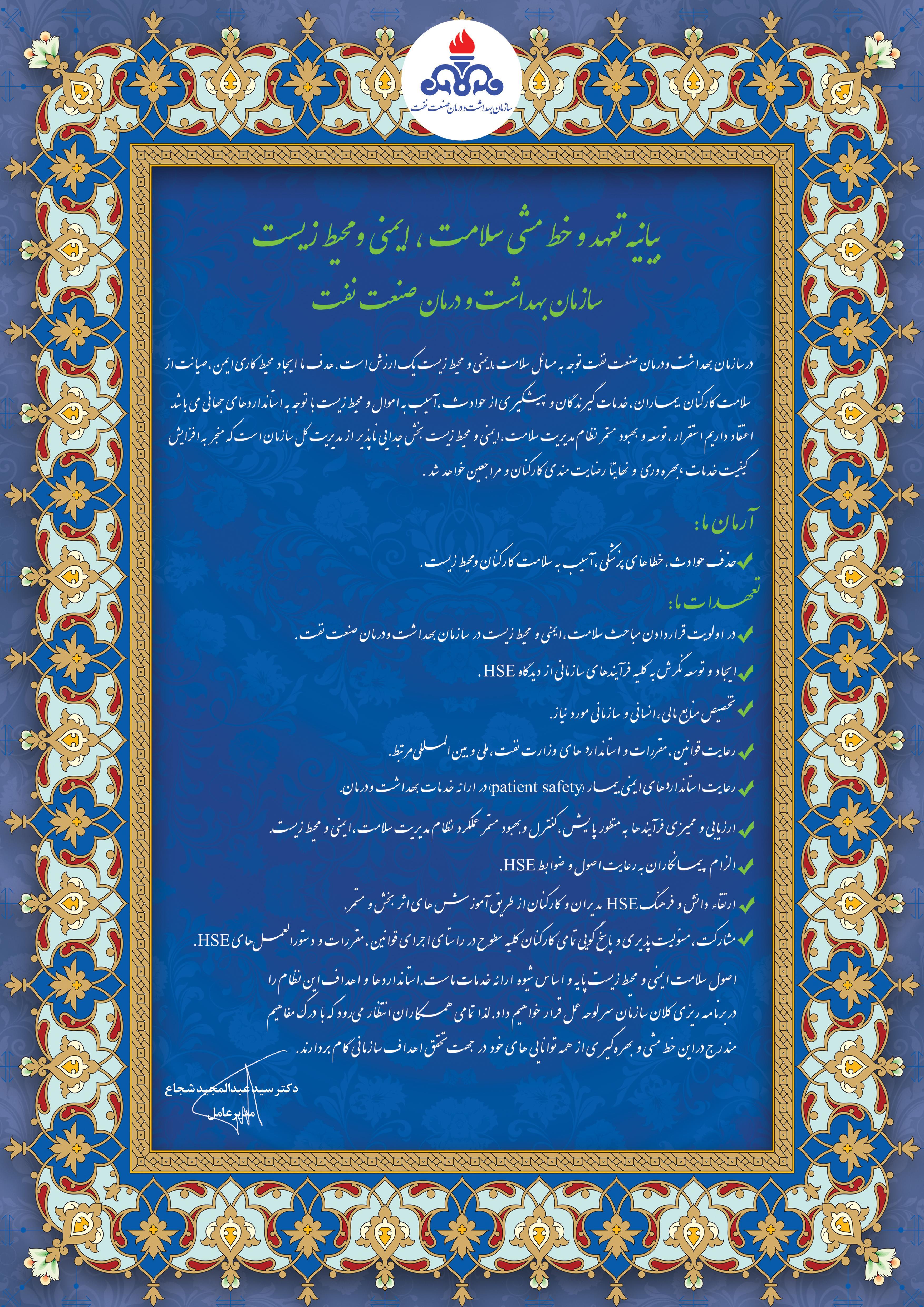 منشورها منشور اخلاقی و کرامت انسانی کارکنان شرکت ملی نفت ایران منشور حقوق بیمار بیانیه تعهد و خط مشی سلامت ، ایمنی و محیط زیست